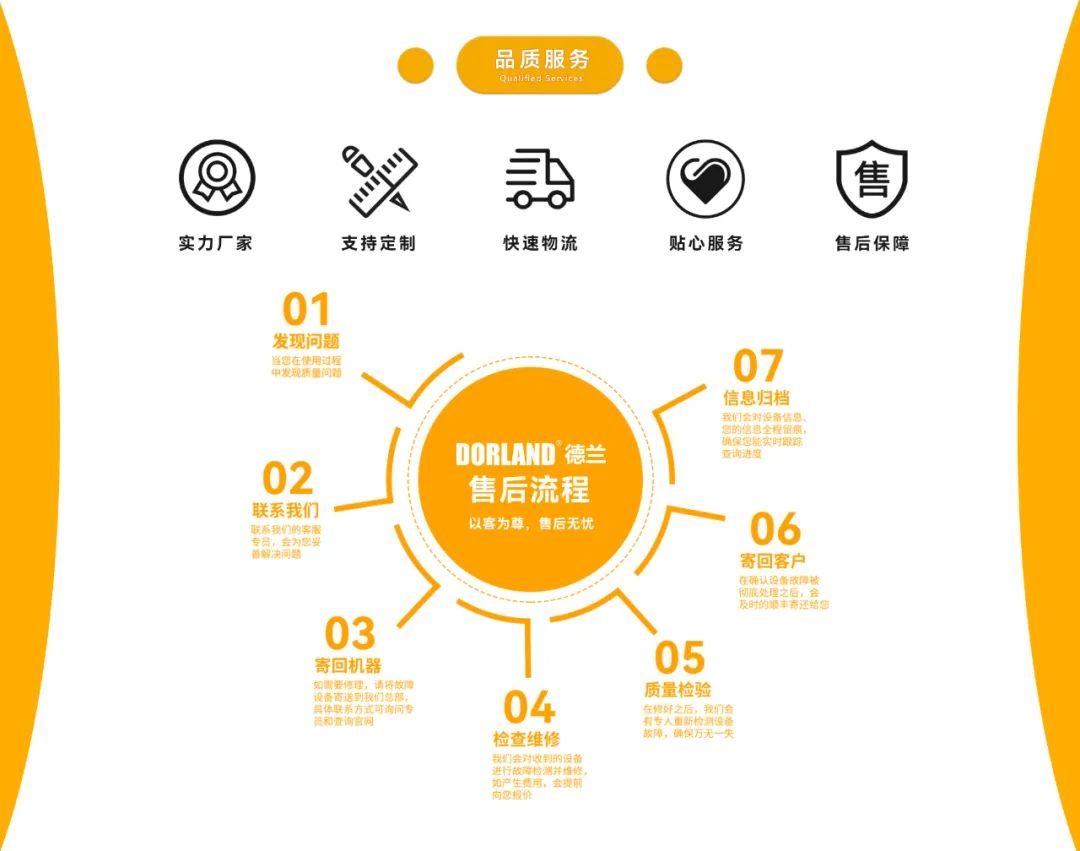 Ti invitiamo sinceramente a contattarci e a partecipare ai nostri questionari post-vendita per valutare i nostri servizi e apporteremo i miglioramenti corrispondenti in base alle tue valutazioni e suggerimenti. DORLAND sarà cmigliorare continuamente il livello di servizio, e la tua soddisfazione sarà sempre il nostro inseguimento.